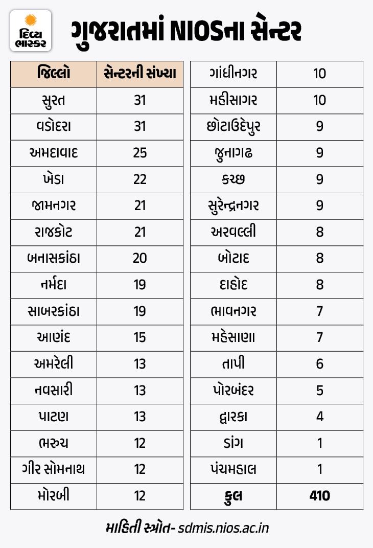 ગુજરાતમાં NIOSની મુખ્ય ઓફિસ ગાંધીનગરમાં આવેલી છે અને રાજ્યભરમાં અલગ-અલગ શહેરોમાં તેના સેન્ટર પણ છે. NIOSની સત્તાવાર વેબસાઇટ પરથી મળેલી જાણકારી પ્રમાણે ગુજરાતના 32 જિલ્લામાં કુલ 410 સેન્ટર આવેલા છે. જેમાં સૌથી વધુ સેન્ટર વડોદરા 31 અને અમદાવાદમાં 25 સેન્ટર આવેલા છે. આ ઉપરાંત સુરત, રાજકોટ, આણંદમાં પણ ઘણા સેન્ટર છે. જો કે શિક્ષણના સત્કાર્યની ઓથ હેઠળ શરૂ થયેલા આમાંના ઘણા સેન્ટરો રૂપિયા છાપવાનું અને ગેરરીતિનું એપી સેન્ટર બની ગયા છે.