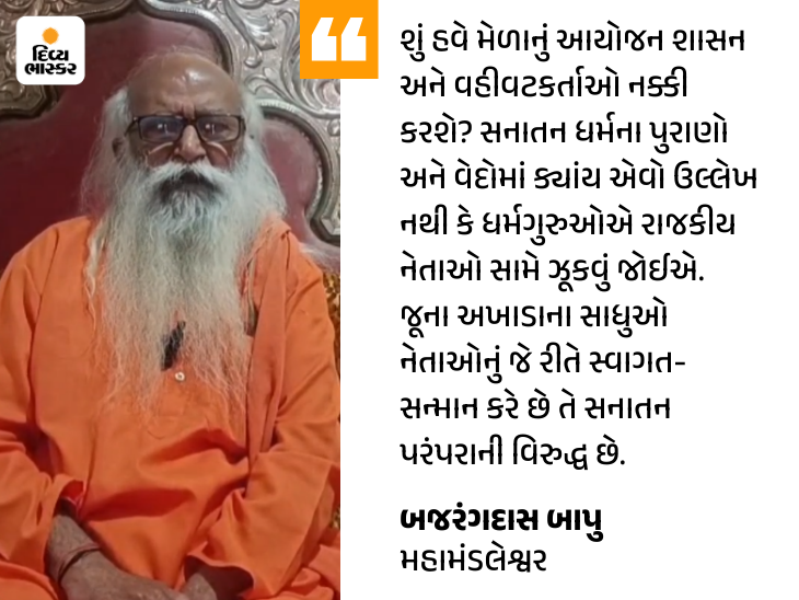 શું હવે મેળાનું આયોજન શાસન અને વહીવટકર્તાઓ નક્કી કરશે? સ્વામી બજરંગદાસ બાપુએ ખાસ કરીને ઇન્દ્રભારતી બાપુ અને મેળાના વહીવટ પર નિશાન સાધતાં કટાક્ષ કર્યો છે કે વહીવટી તંત્ર અને અધિકારીઓ માત્ર ભવનાથના ગણ્યાગાંઠ્યા ચાર સાધુઓ અને ખાસ કરીને ઇન્દ્રભારતી કહે એટલું જ કરે છે. તેમણે પ્રશ્ન ઉઠાવ્યો છે કે શું હવે મેળાનું આયોજન શાસન અને વહીવટકર્તાઓ નક્કી કરશે? સનાતન ધર્મના પુરાણો અને વેદોમાં ક્યાંય એવો ઉલ્લેખ નથી કે ધર્મગુરુઓએ રાજકીય નેતાઓ સામે ઝૂકવું જોઈએ. સંતો તો રાજાઓના પણ રાજા છે, જેમના શરણમાં સ્વયં ભગવાન રામ અને કૃષ્ણ આવ્યા હતા છતાં આજે જૂના અખાડાના સાધુઓ નેતાઓનું જે રીતે સ્વાગત-સન્માન કરે છે એ સનાતન પરંપરા વિરુદ્ધ છે.