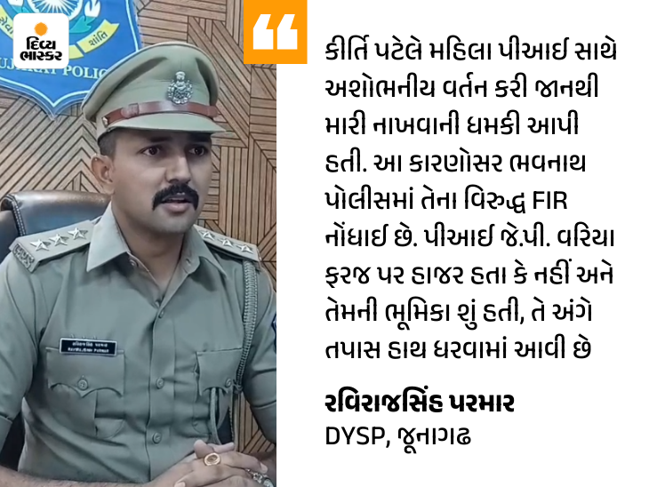 આ ઘટના સમયે ફરજ પર હાજર પોલીસ અધિકારી પીઆઈ કે.જે.મોડ સાથે કીર્તિ પટેલે અભદ્ર વર્તન કર્યું હતું. જ્યારે અધિકારીએ વિવાદ વધુ ન વણસે તે હેતુથી તેને રોકી બાજુ પર લઈ જવાનો પ્રયાસ કર્યો ત્યારે કીર્તિ પટેલે મહિલા પીઆઈ સાથે અશોભનીય વર્તન કરી જાનથી મારી નાખવાની ધમકી આપી હતી. આ કારણોસર ભવનાથ પોલીસમાં કીર્તિ પટેલ વિરુદ્ધ ફરજમાં રૂકાવટનો ગુનો દાખલ કરવામાં આવ્યો છે.
