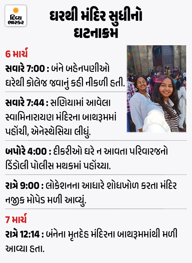 સ્વામિનારાયણ મંદિરના બાથરૂમમાંથી બે વિદ્યાર્થિનીના મૃતદેહ મળ્યા 6 માર્ચ, 2026એ સુરતમાં ડિંડોલી ખાતે રહેતી બી.કોમની બે વિદ્યાર્થિનીના સણિયા કણદે ખાતે આવેલા નવનિર્મિત આત્મીય સંસ્કારધામ સ્વામિનારાયણ મંદિરના બાથરૂમમાંથી મૃતદેહ મળતા ચકચાર મચી ગઇ હતી. બહેનપણીઓના મૃતદેહ પાસેથી ઈન્જેક્શન અને એનેસ્થેસિયાની દવાની બોટલો મળી આવી હતી. પોસ્ટમોર્ટમ દરમિયાન બંનેએ એનેસ્થેસિયાના ઓવરડોઝ દવાના ઈન્જેક્શનો લઈ આપઘાત કર્યો હોવાનું જાણવા મળ્યું હતું.