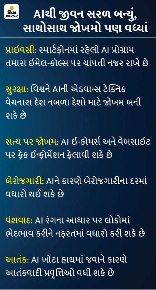 AI વિશ્વ માટે ખતરનાક કેમ છે? આર્ટિફિશિયલ ઈન્ટેલિજન્સથી થનારા ખતરાને લઈને ટેક કોમ્યૂનિટીમાં એક લાંબી માથાકૂટ ચાલી રહી છે. તેઓનું માનવુ છે કે, ‘અત્યારે જેટલું સરળ અને સારુ લાગી રહ્યું છે, તે AI પછી લોકો માટે અનેક પ્રકારની મુશ્કેલીઓ ઊભી કરી દેશે.’ AI ઓટોમેશનનાં કારણે લોકોની નોકરીઓ જઈ રહી છે. રાજનીતિ માટે AI એલ્ગોરિધમનાં કારણે સમાજમાં ખોટી માહિતી કે નફરત ફેલાઈ શકે છે અને એવુ થયુ પણ છે.