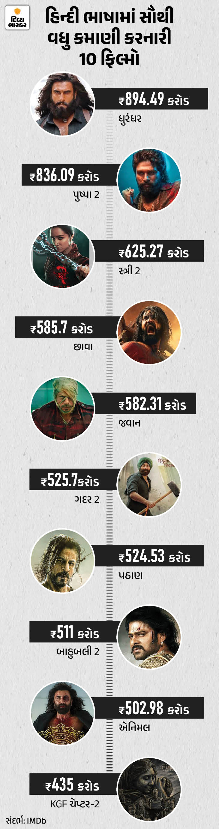 2026ની સૌથી મોટી ફિલ્મ બની માત્ર ત્રણ દિવસમાં, ‘ધૂરંધર 2’ એ ‘બોર્ડર 2’ (₹470 કરોડ) ને પાછળ છોડીને 2026ની સૌથી વધુ કમાણી કરનારી ભારતીય ફિલ્મ બની. રવિવારના કલેક્શન પછી, તેણે ‘ગદર 2’ (₹691 કરોડ) અને ‘સલાર’ (₹690 કરોડ)ની આજીવન કમાણીને પણ વટાવી દીધી છે.